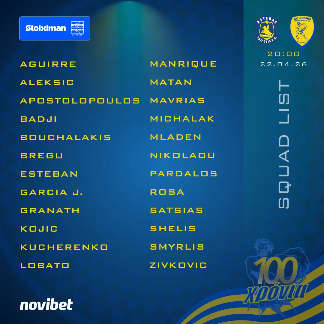 21/04/2026Στην αποστολή του αυριανού εκτός έδρας αγώνα Stoiximan Super League Playouts με τον Asteras Aktor συμμετέχουν οι ποδοσφαιριστές: Αγκίρε, Άλεξιτς, Αποστολόπουλος, Μπάντζι, Μπουχαλάκης, Μπρέγκου, Εστεμπάν, Χ. Γκαρσία, Γκράναθ, Κόγιτς, Κουτσερένκο, Λομπάτο, Μανρίκε, Ματσάν, Μαυρίας, Μίχαλακ, Μλάντεν, Νικολάου, Παρδαλός, Ρόσα, Σατσιάς, Σιέλης, Σμυρλής, Ζίβκοβιτς.