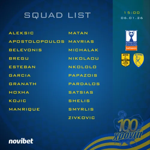 05/01/2026Στην αποστολή του αυριανού εκτός έδρας αγώνα κυπέλλου Ελλάδας Betsson με τον Άρη, συμμετέχουν οι ποδοσφαιριστές: Άλεξιτς, Αποστολόπουλος, Μπελεβώνης, Μπρέγκου, Εστεμπάν, Γκαρσία, Γκράναθ, Χότζα, Κόγιτς, Μανρίκε, Ματσάν, Μαυρίας, Μίχαλακ, Νικολάου, Ενκολόλο, Παπαζώης, Παρδαλός, Σατσιάς, Σιέλης, Σμυρλής, Ζίβκοβιτς.